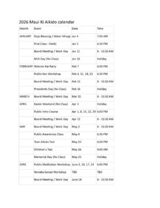 Maui Ki Aikido Special Events Nothing from January 2, 2026 to February 2, 2026. Download Calendar PDF Calendar